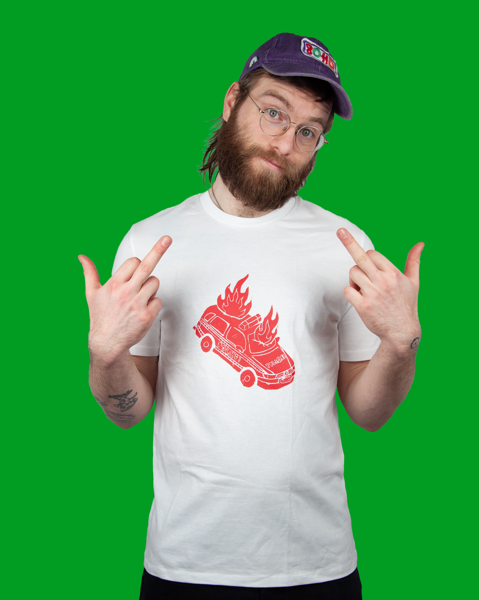 Polizei von @finnhafnmr ( ursprünglich ein Linoldruck) greift das ikonische Protestmotiv des brennenden Polizeiautos auf und holt es als VW-Passat nach Deutschland. Es steht für den stillen Moment nach der Eskalation. Welche Konflikte die Wut, Ohnmacht und den Widerstand gegen die Ordnung ausgelöst haben, bleibt offen. Fest steht: Polizeigewalt ist scheiße und ein Symptom von tiefgreifenden strukturellen Problemen im System. #161